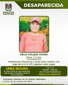 𝘿𝙀𝙇𝙄𝘼 𝘾𝙊𝙇𝙌𝙐𝙀 𝘾𝙃𝙐𝙍𝘼, de 13 años, fue vista por última vez el sábado 18 de octubre de 2025, aproximadamente a horas 19:00, en el…